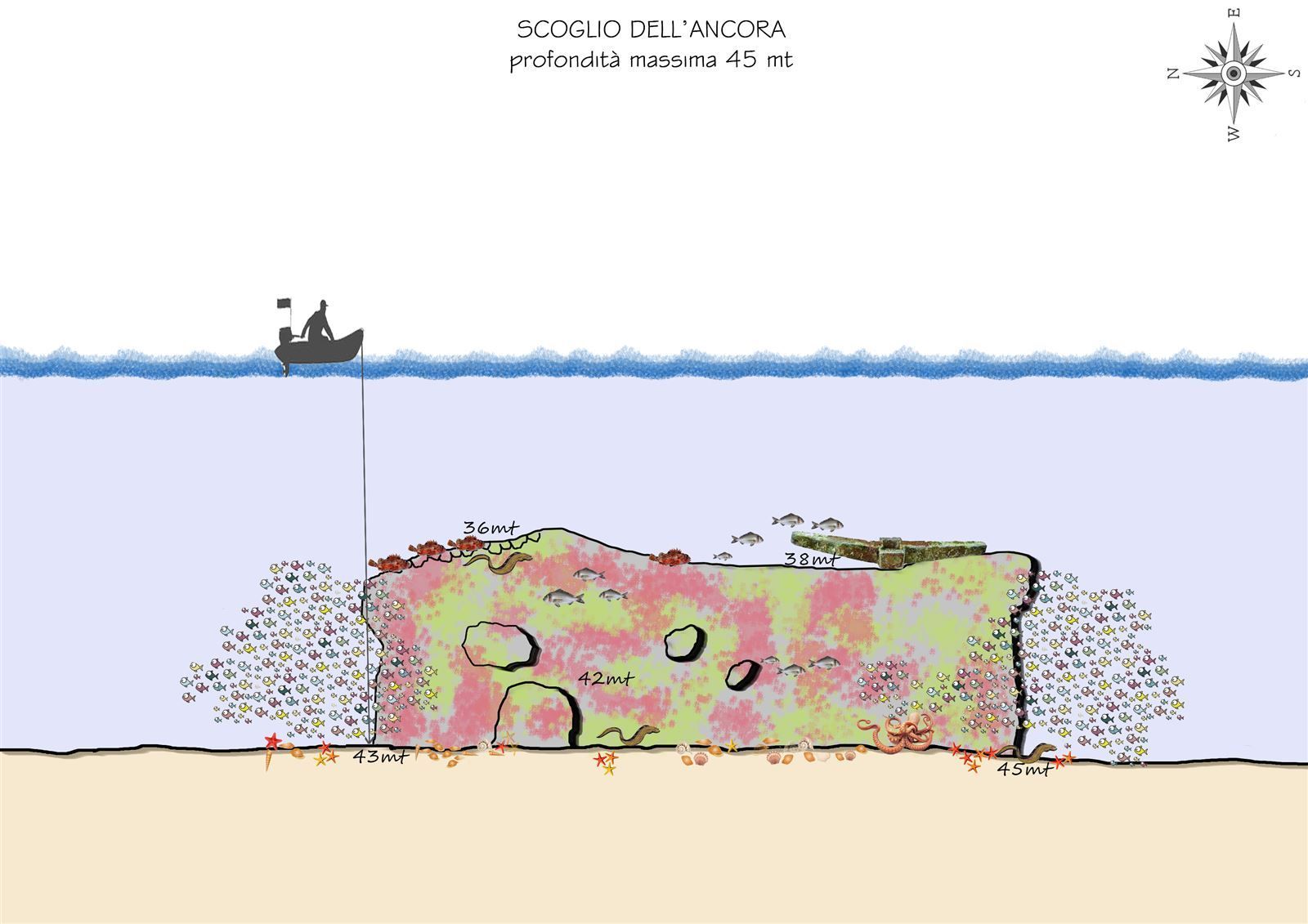 Semisepolta nella rena del pianoro sabbioso che costituisce il fondale del le Grotticelle, a quaranta metri di profondità,spunta un’ancora romana rivestita da spugne incrostanti e briozoi. L’ancora è posata proprio ai margini della caduta verso la vallata sottomarina che si insinua nelle Grotticelle fino a poca distanza dalla costa, una collina di sabbia sostenuta da una parete rocciosa su cui vivono fitte colonie di briozoi e di spugne.