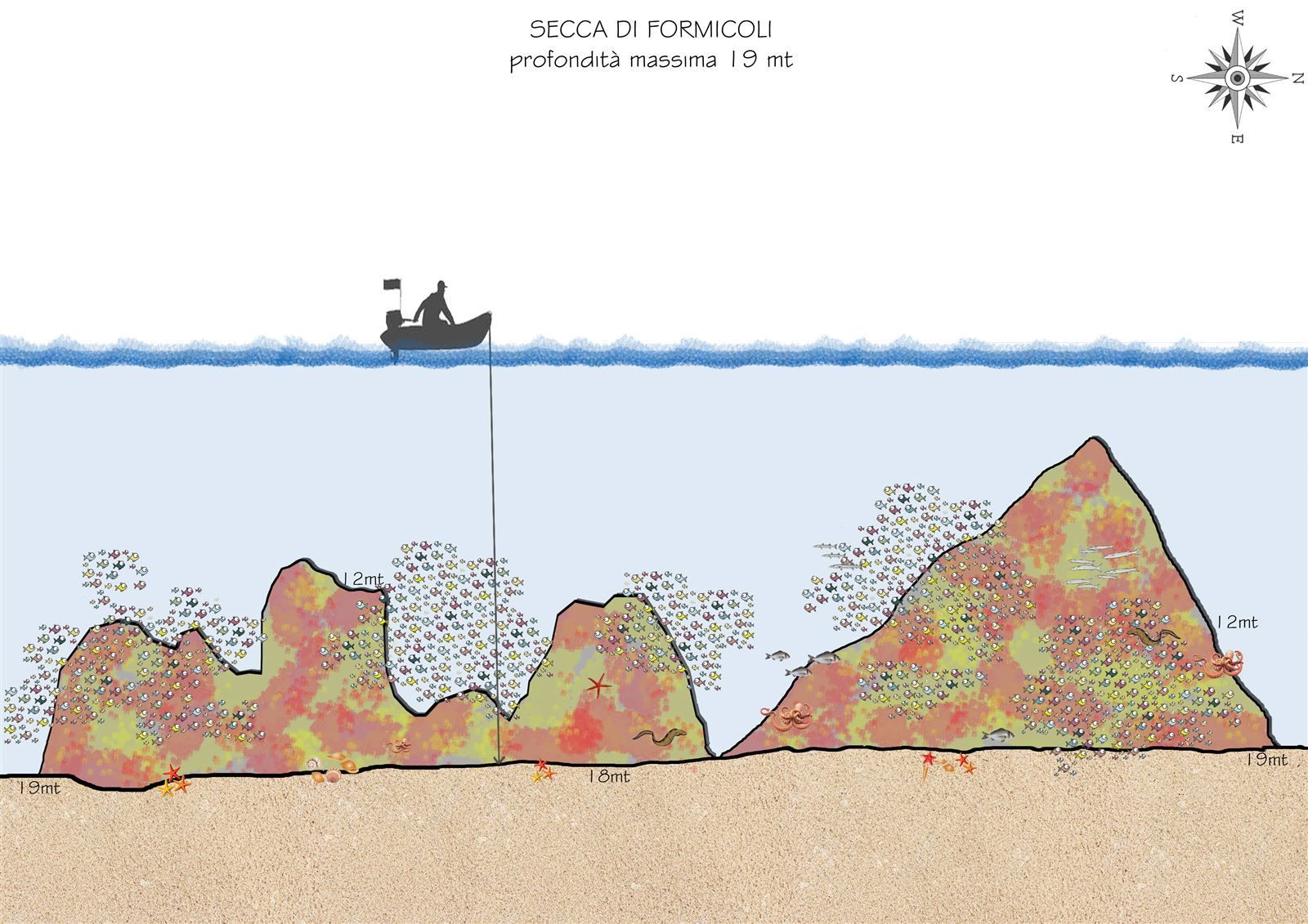 Fra Riaci e Torre Marino, a circa 300 metri dalla costa spuntano dalla superficie una serie di scogli affioranti: sono i Formicoli, ciò che resta, si dice, di un antico porto romano. Piacevole e non troppo profonda l’immersione: i Formicoli proseguono sott’acqua verso il largo dando vita a una dorsale di scogli e scoglietti che poggiano sulla sabbia a 18 metri di profondità. È I’habitat ideale per cernie, saraghi e, fra ottobre e novembre, corvine: ognuna delle mille tane che si creano fra i sassi sommersi ospita qualche animale, tanto che questo è uno dei “buoni indirizzi” per gli appassionati di pesca in apnea. Fra le rocce si apre un tunnel, nel quale sarebbe bene non passare per non rovinare i fragili animaletti che vivono attaccati alla roccia: ma se proprio non volete rinunciarvi, abbiate almeno I’ accortezza di non urtare contro le pareti e di trattenere il fiato finché sarete sotto la volta, in modo tale da non emettere bolle d’aria che, intrappolate nella volta, condannerebbero a morte certa anche gli organismi più resistenti. Un’immersione piacevolissima e tranquilla, questa, adatta ai principianti ma interessante anche per gli esperti. Più verso il largo, sui 27-30 metri di profondità, la sene di scogli si chiude con la secca esterna dei Formicoli.